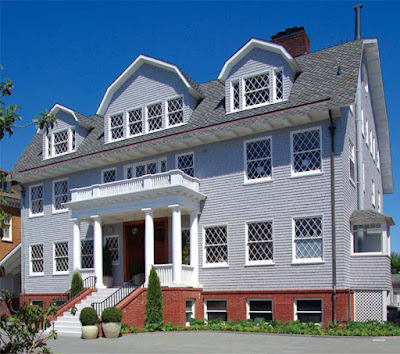 The essentially symmetrical, red brick and grey shingled Dutch Colonial Revival residence sits down a long, private and gated driveway on an elevated 14,000 (or so) square foot lot in an area of Pacific Heights known as the Gold Coast, so called because it's extra fancy even for fancy pants Pac Heights. The front of the house, with a suburban 7-11 parking lot-sized motor court, is all but hidden from the street while the back of the house sits high and proud with commanding bridge, bay and city views.